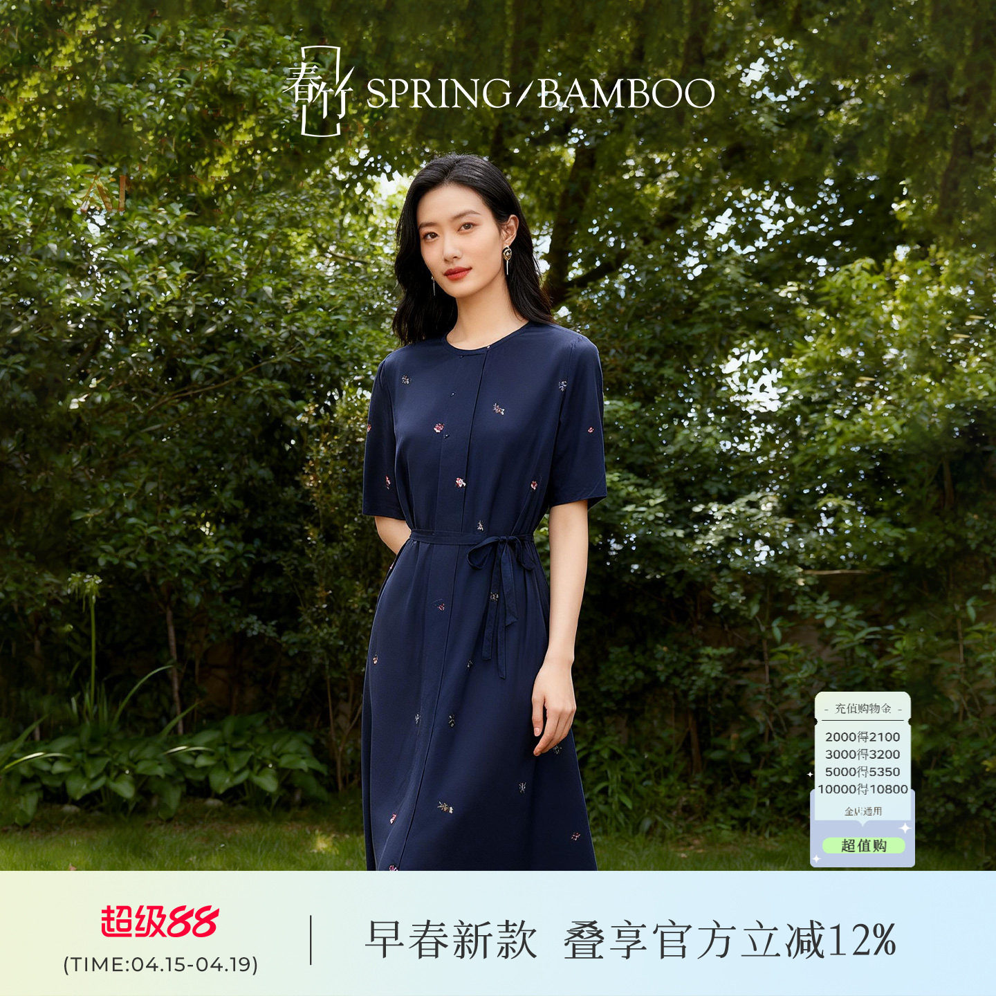 春竹2026春夏新款桑蚕丝圆领显瘦亲肤亮钻印花藏蓝女士真丝连衣裙