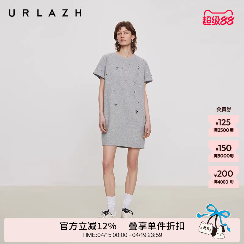 URLAZH有兰夏季新款圆领落肩直筒精致重工亮钻格雷短袖连衣裙女