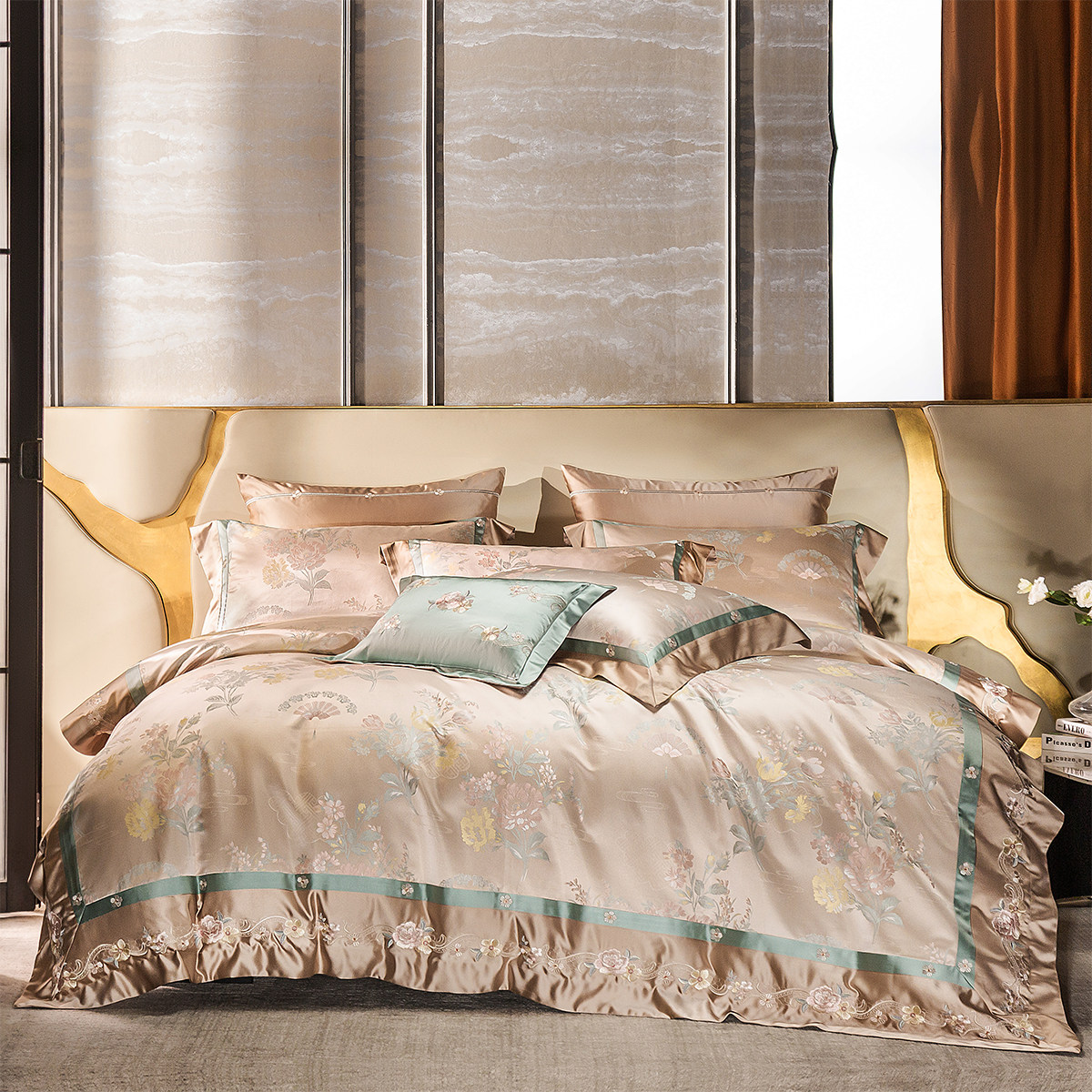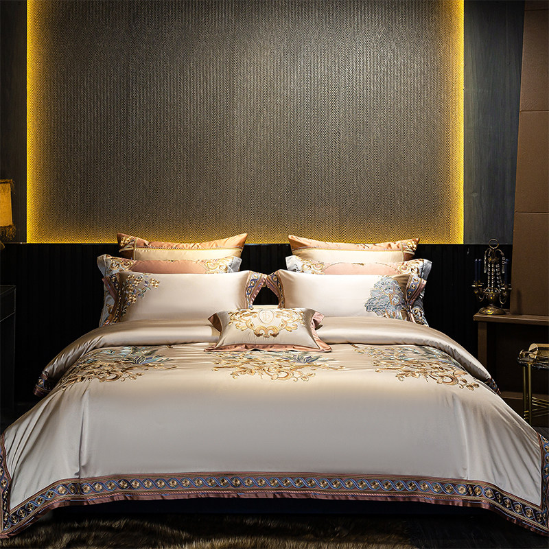 欧式高端全棉刺绣四件套140支真丝棉纯棉高级感贡缎提花床上用品