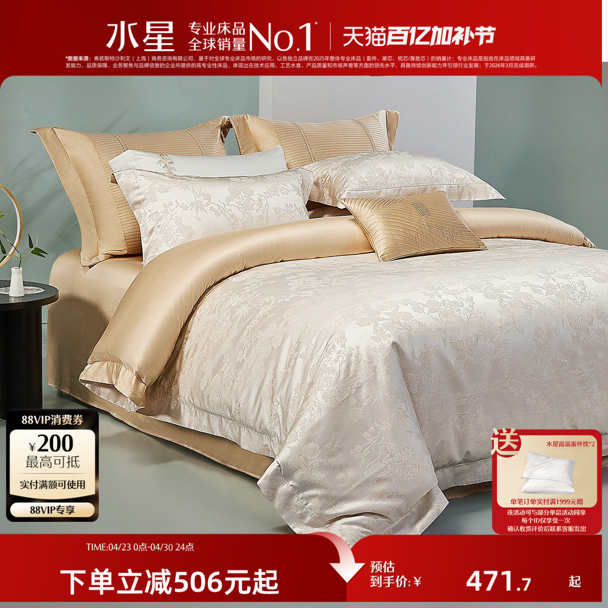 水星家纺提花四件套60支长绒棉贡缎套件轻奢被套床单家用床上用品