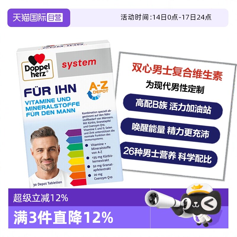 【自营】德国双心男士复合维生素B族多维辅酶钙镁锌 男性活力专研