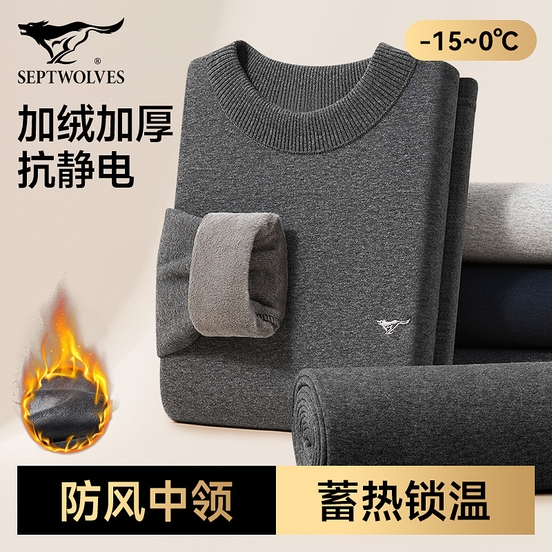 七匹狼中领内衣男士加绒加厚保暖内衣套装秋冬棉毛衫上衣裤子套装