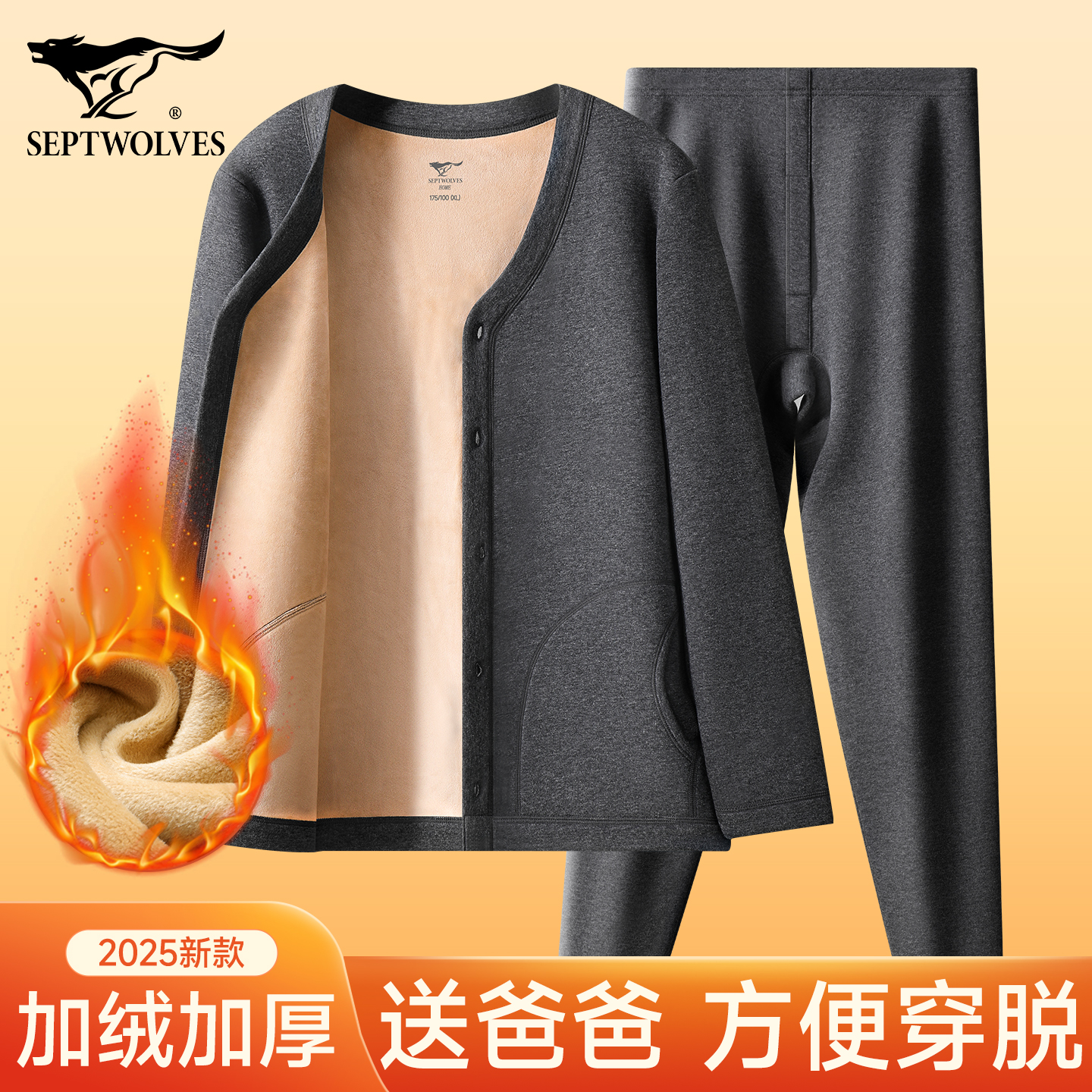 七匹狼男士加绒加厚保暖内衣开衫款中老年爸爸冬季对襟可外穿套装