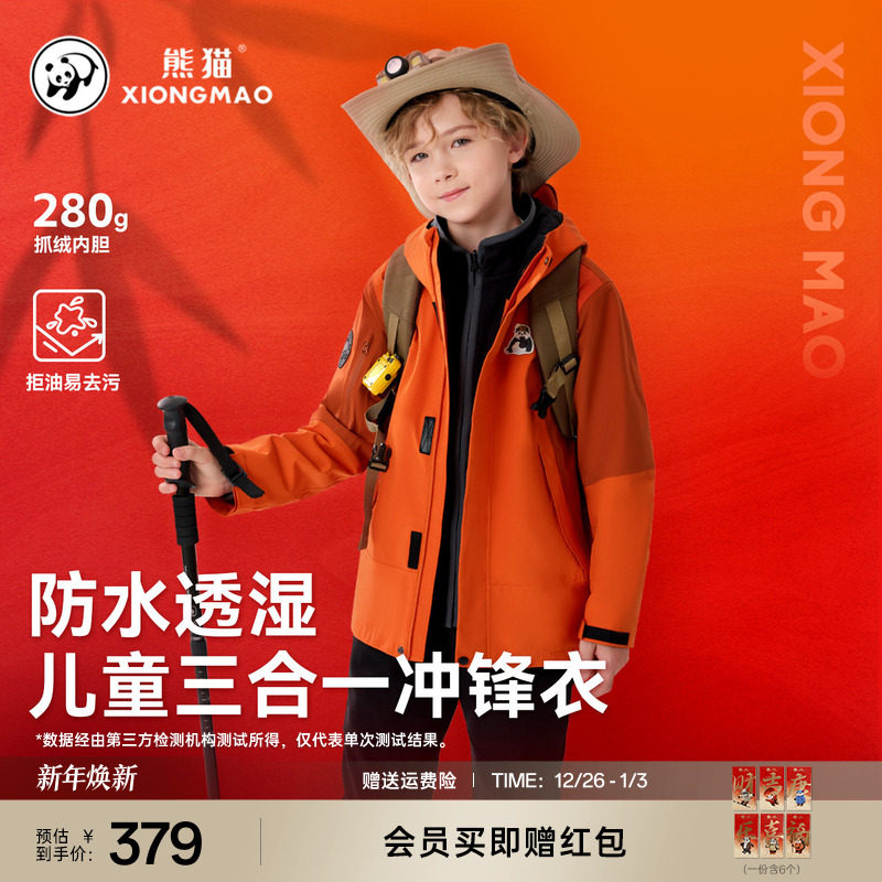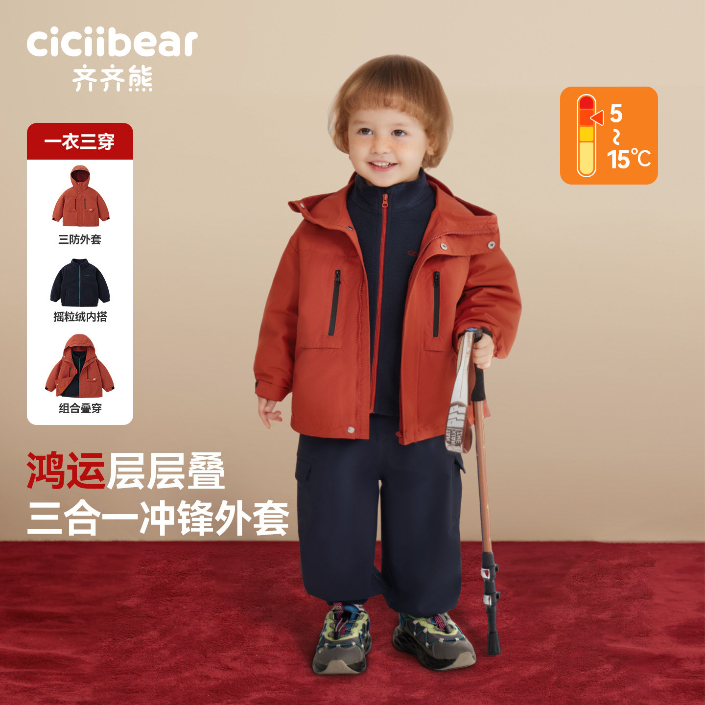 [三防]齐齐熊宝宝三合一冲锋外套男童红色新年服冬儿童户外保暖衣