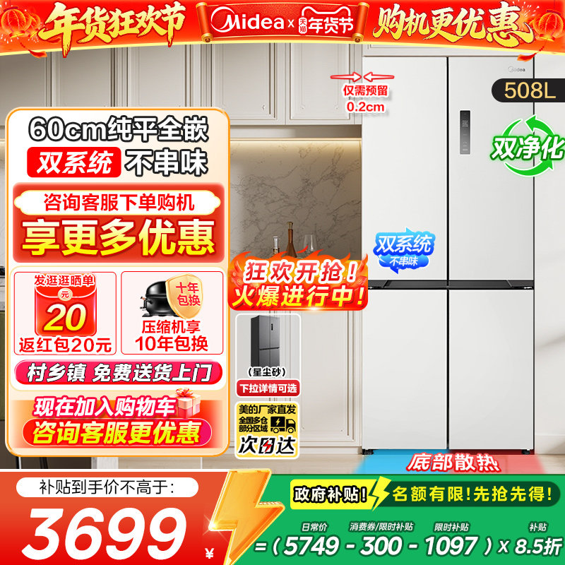 【政府换新补贴】美的冰箱508L双系统零嵌十字双对开多门白色家电