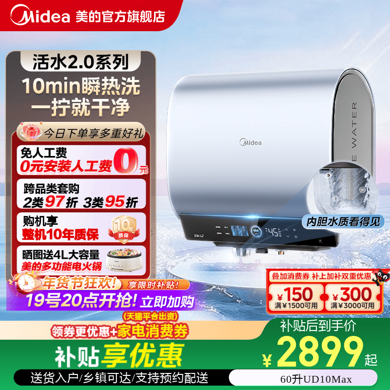 美的活水2.0电热水器UD10MAX双胆扁桶洗澡家用一级家电官方旗舰店