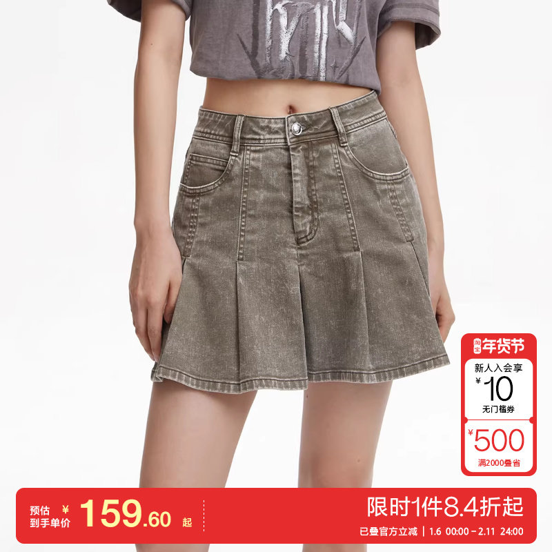 香蕉宝贝清仓特卖甜酷复古洗水牛仔压褶半裙明线装饰高腰百褶短裙
