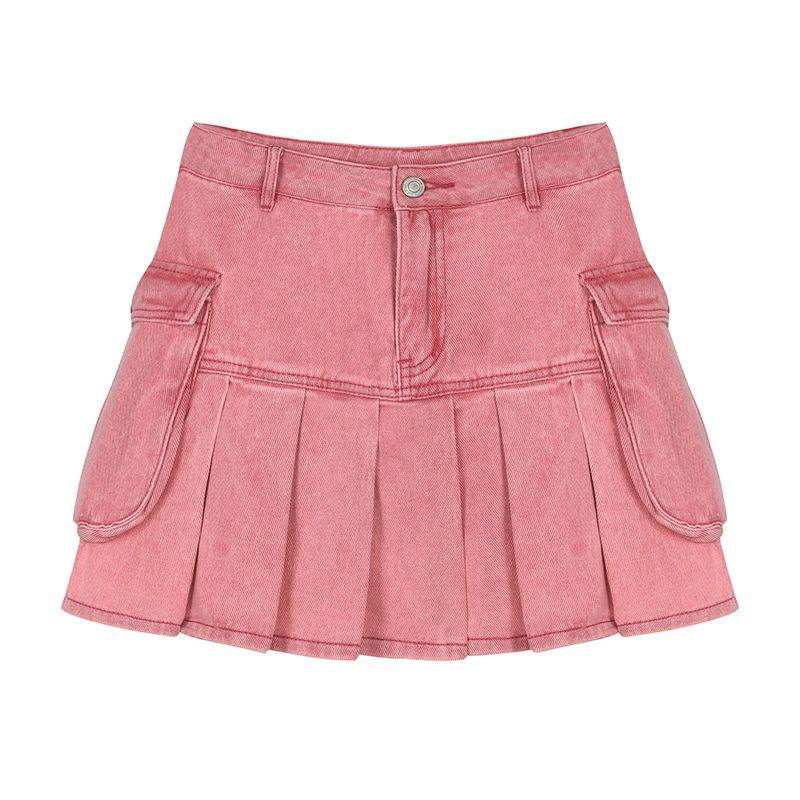 橙绢女装#粉色纯欲风高腰百褶短裙子夏季辣妹垂感a字牛仔半身裙女