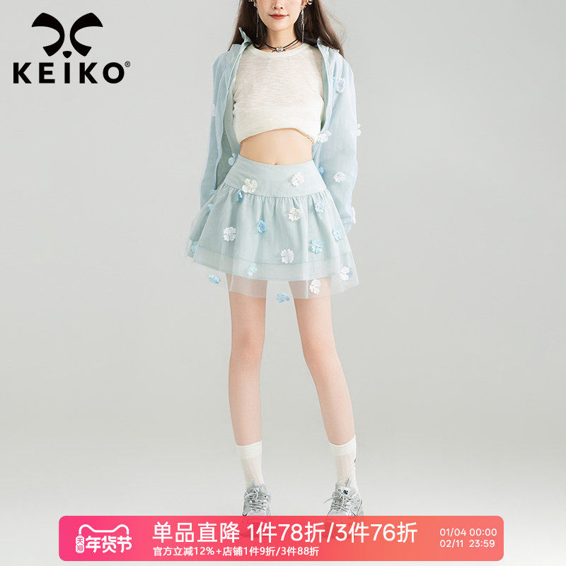 KEIKO [扎花] 轻纱拼接A字半身裙夏季防走光轻运动高腰百褶短裙子