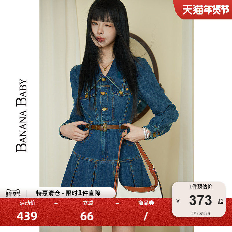 BANANA BABY2025年秋季新款牛仔连衣裙女复古polo领高腰百褶短裙