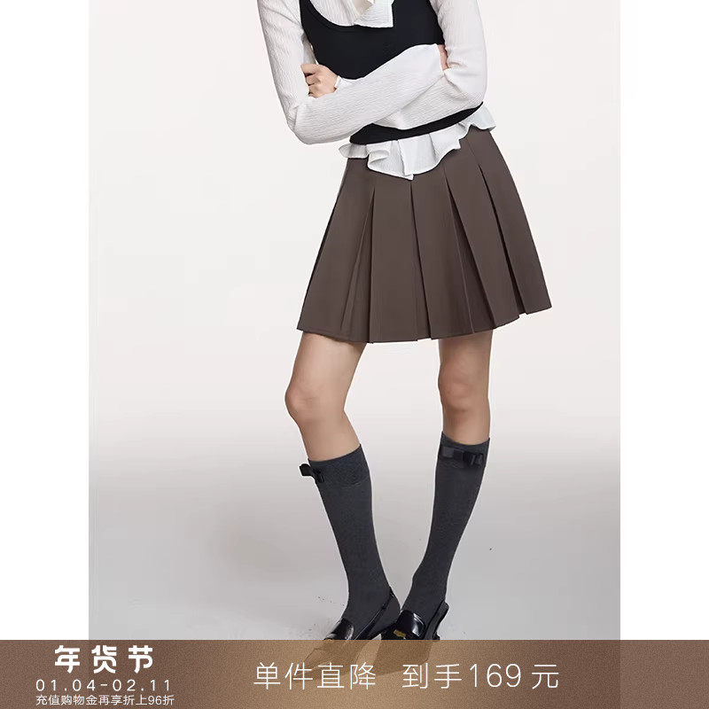拉系列S/M/L正品清仓女冬格子毛呢厚保暖高腰百褶短裙4A2730驼色