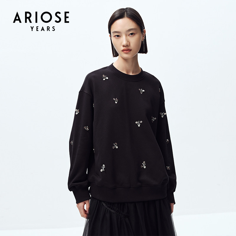 艾诺丝雅诗【樱花心情】秋新款上衣套头亮片圆领纯棉卫衣20126004