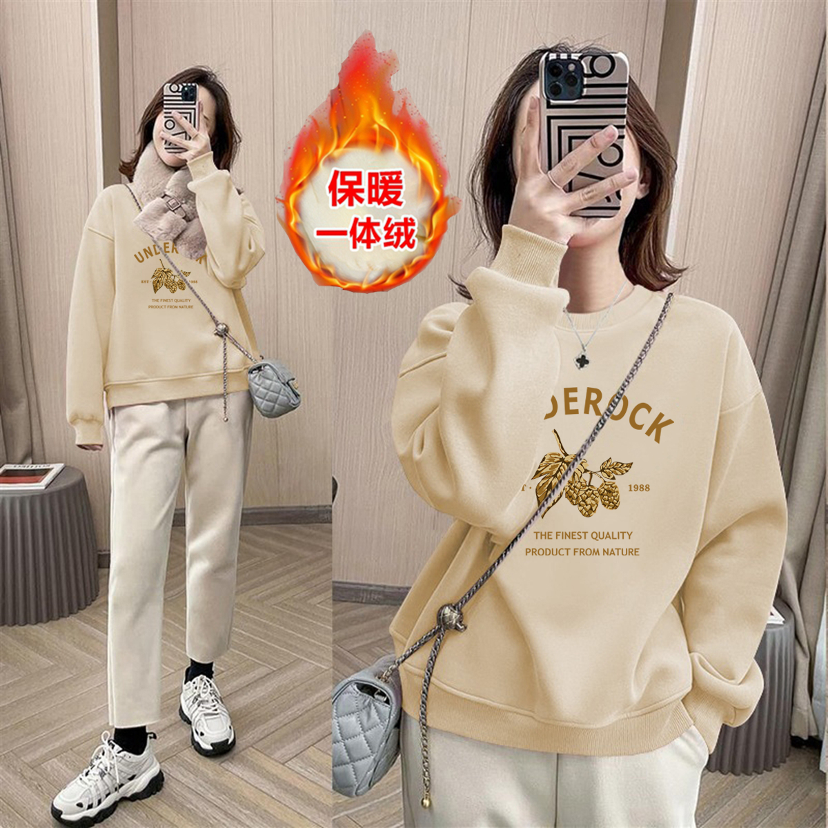 山东即墨流行纯棉卫衣女秋冬正肩加绒简约高级感洋气加厚杏色外套