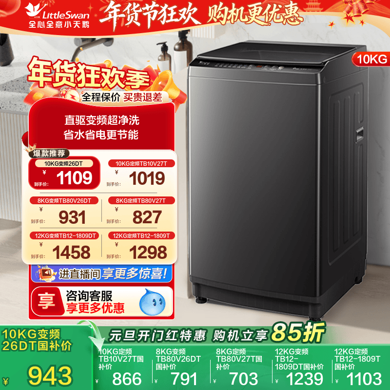 以旧换新 小天鹅波轮洗衣机大容量家用全自动8/10/12KG变频26DT