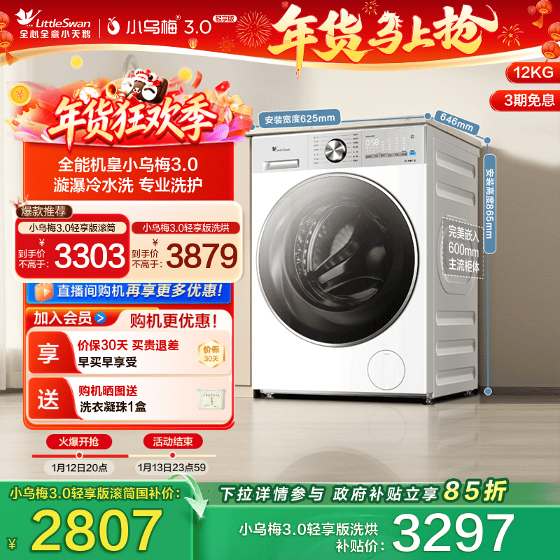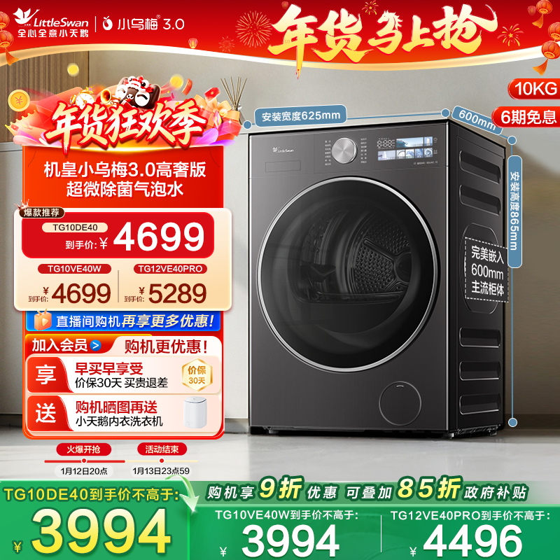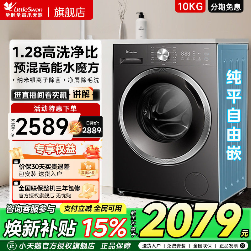 [纯平全嵌]小天鹅小乌梅3.0家用12/10KG全自动变频滚筒洗衣机 E40