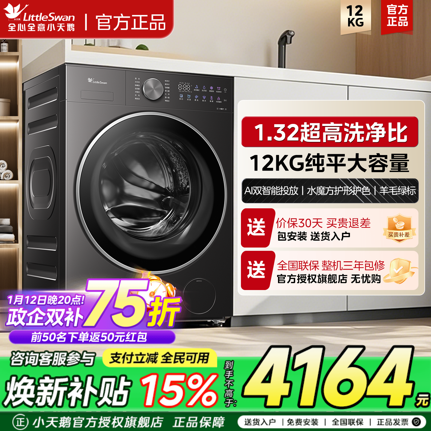 小天鹅洗衣机12KG大容量全自动家用一级能效除螨变频波轮官方旗舰