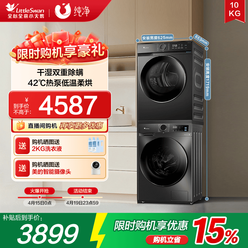 [水魔方]小天鹅洗烘套装12KG洗衣机+10KG热泵烘干衣组合618P/628P