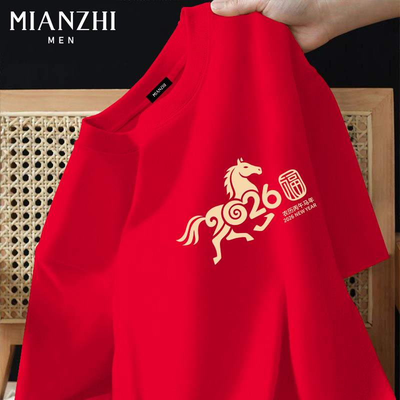 棉致红色纯棉短袖t恤男2026马年本命年衣服宽松年会新年定制体恤