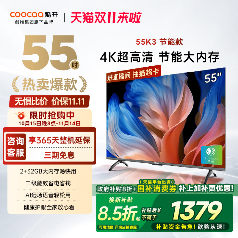 【15%补贴】创维酷开K3 55英寸节能款4K液晶家用官方正品电视机65