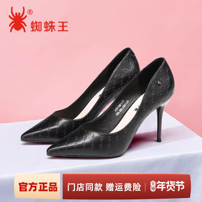 蜘蛛王女鞋秋季正品正装职业鞋女百搭尖头浅口通勤细跟黑色高跟鞋
