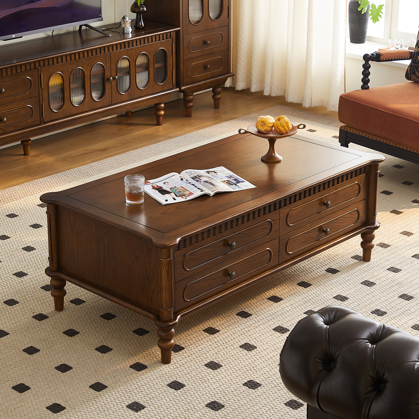 宜宝易森美式复古茶几美式实木茶几中古风咖啡桌茶桌弧形圆角台面
