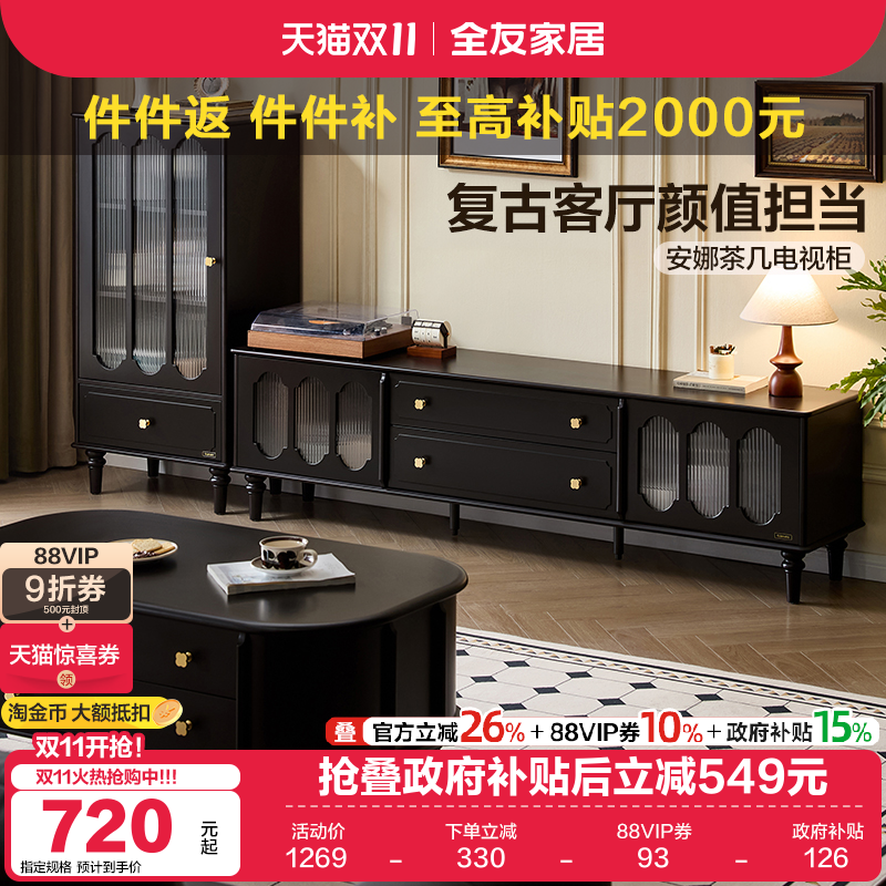 全友家居美式复古风茶几电视柜组合2025新款黑色实木腿储物收纳柜