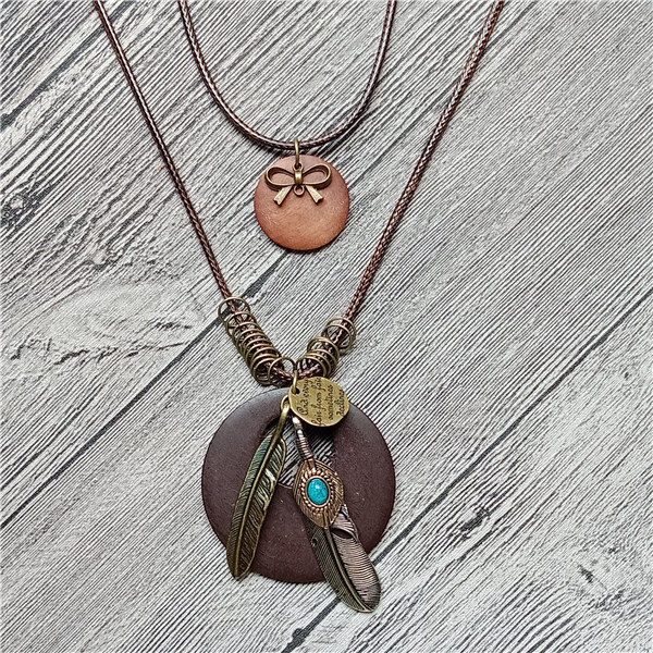 复古羽毛长款项链复古民族风木质文艺范挂件女士毛衣链衣服配饰品