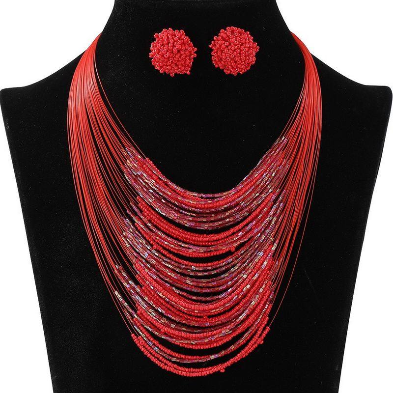 波西米亚多层米珠项链耳环套装复古民族风毛衣链女士多层网红饰品
