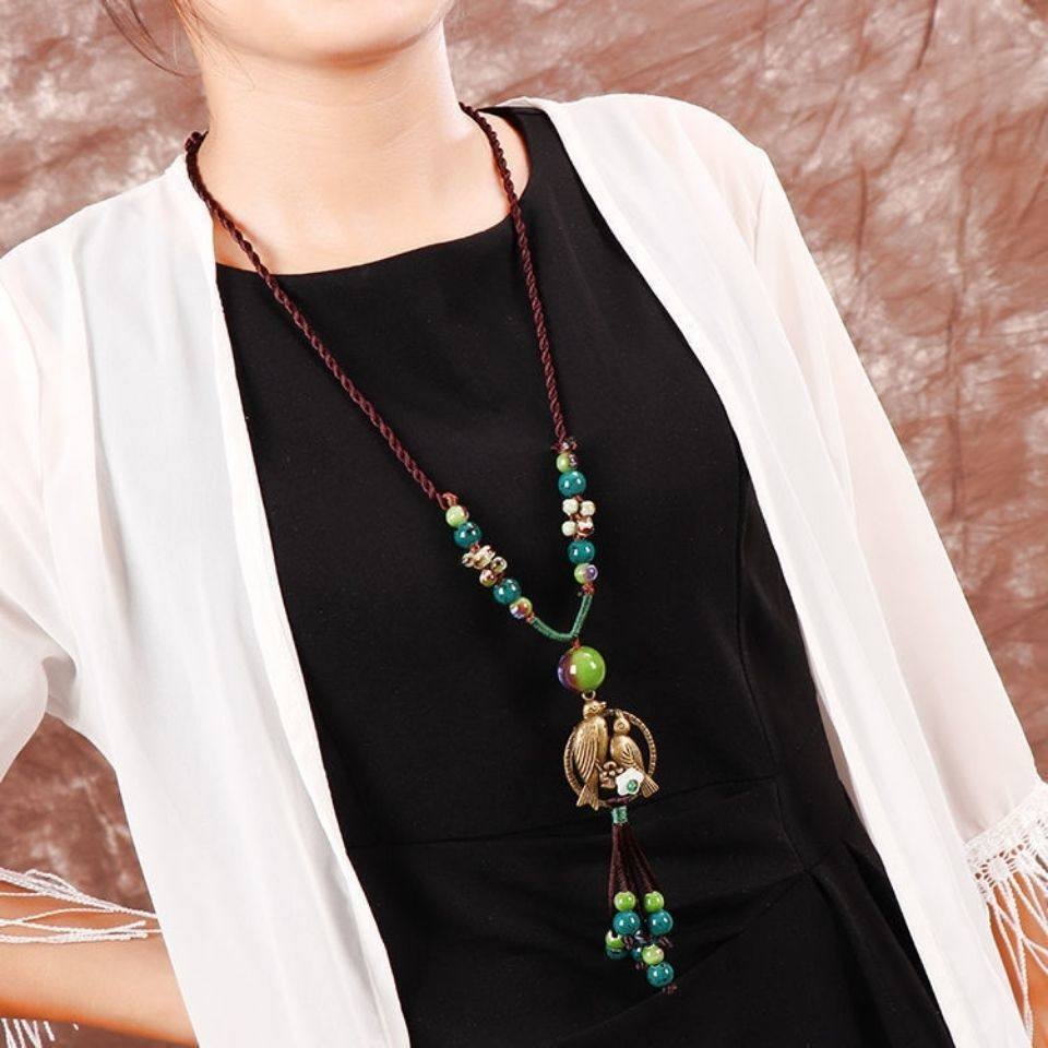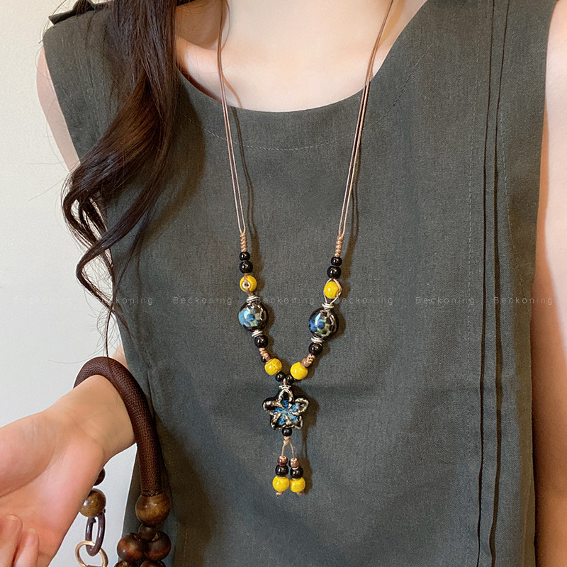 新中式复古陶瓷花朵串珠项链女士民族风长款流苏毛衣链高级感配饰