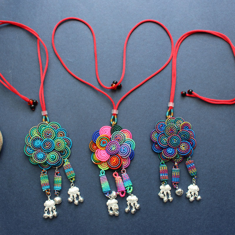 23年包邮复古民族风大理纯手工七彩线花朵长命锁吊坠项链女式毛衣