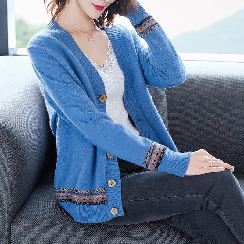 女士针织衫2026新款春秋款V领拼色长袖民族风开衫外套毛衣女上衣