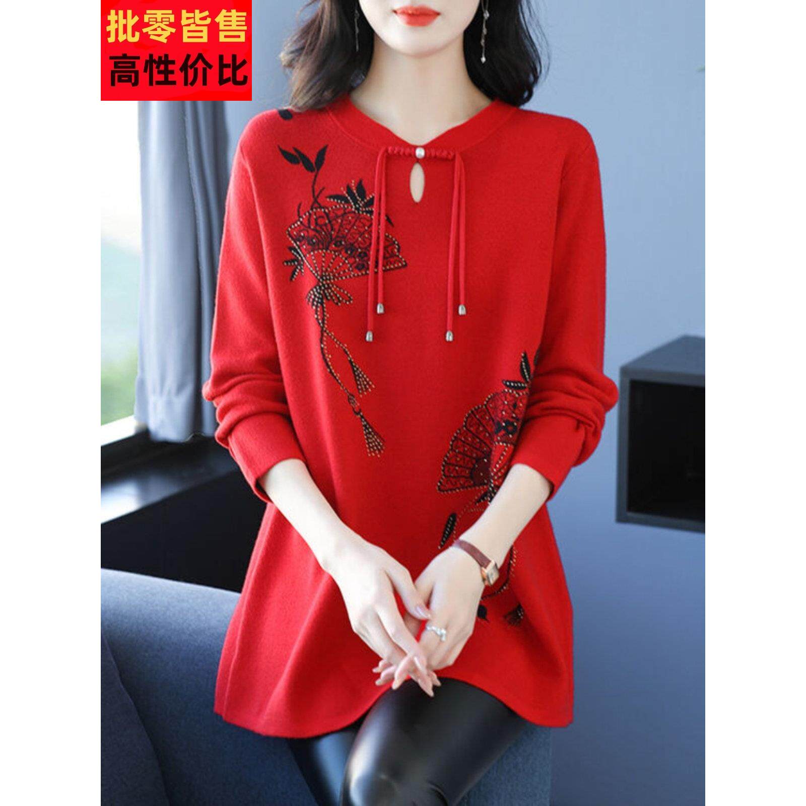 民族风格中国风新款女式秋冬母服大码红色羊毛衫动物年中长针织底