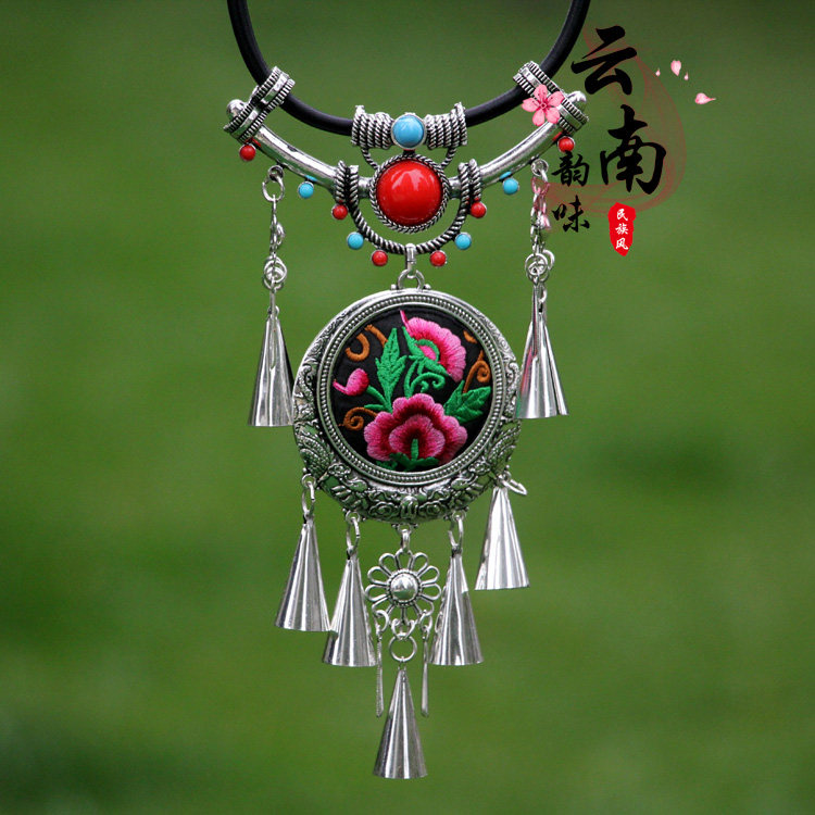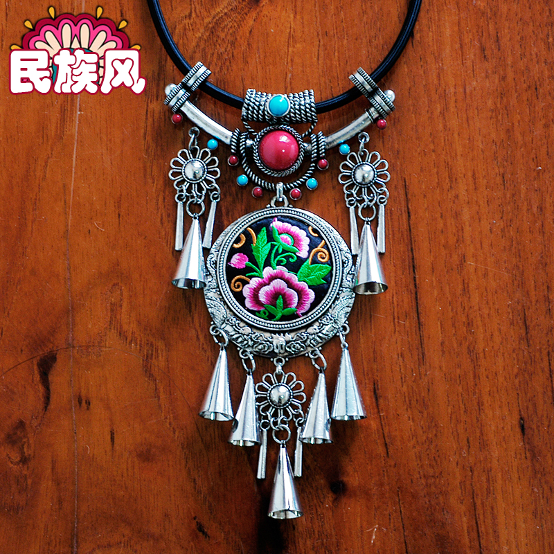 民族风项链女士挂件衣服配饰苗银刺绣吊坠长款流苏挂链休闲毛衣链