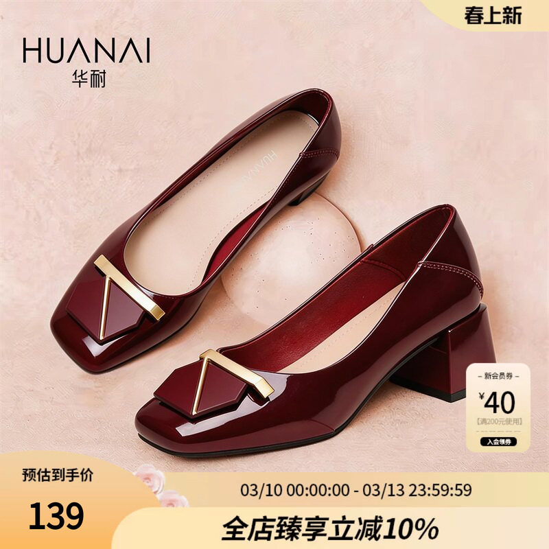 华耐粗跟单鞋女2026新款浅口高跟鞋女鞋酒红色妈妈鞋喜婆婆婚宴鞋