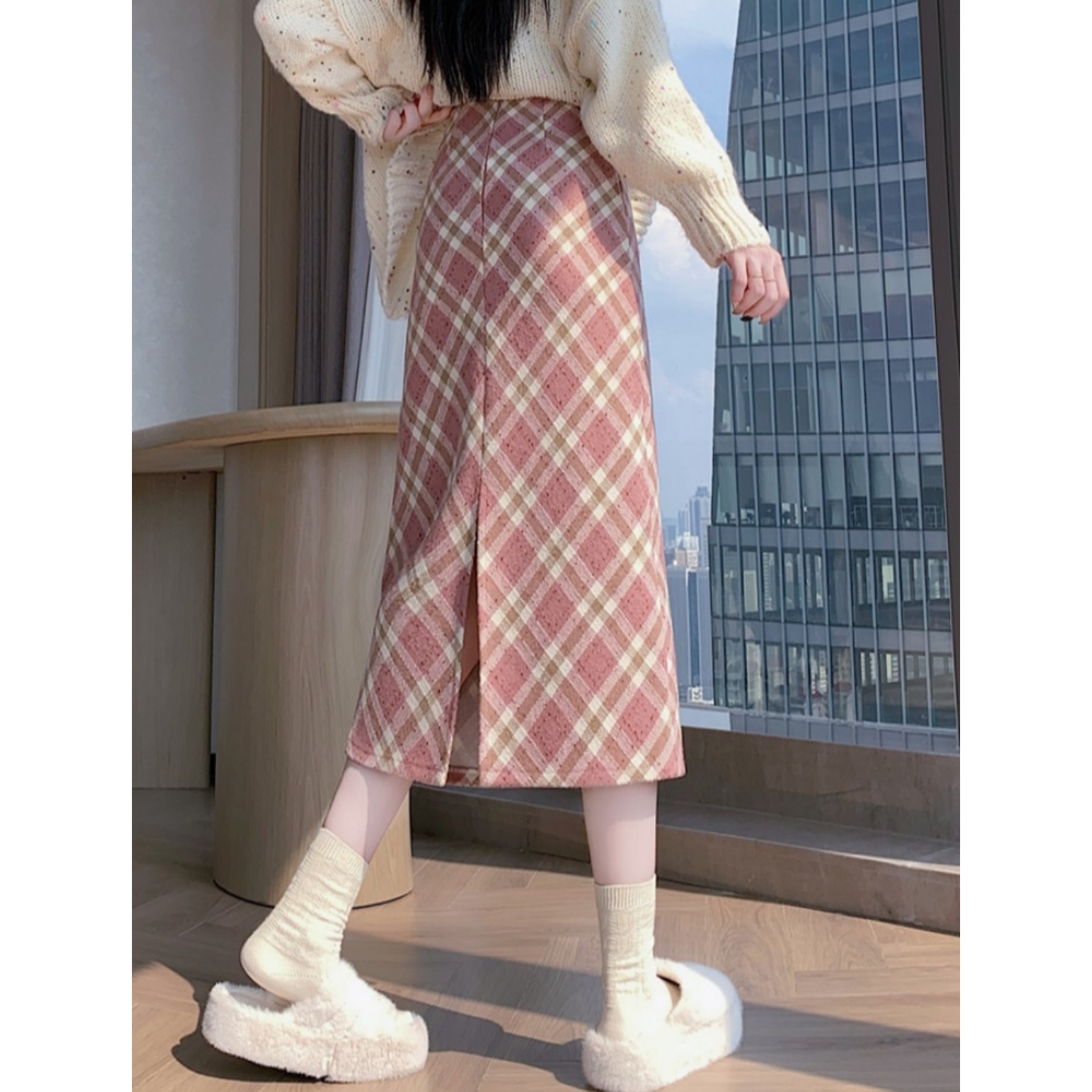 大码甜美粉色格子毛呢包臀半身裙女秋冬款韩系后开叉直筒a字长裙