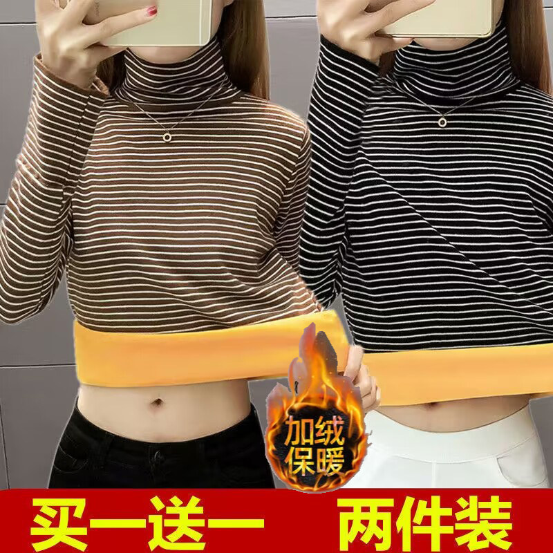 秋冬德绒保暖高领条纹长袖T恤女宽松内搭大码打底衫加绒加厚上衣
