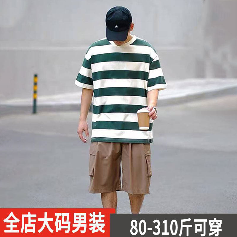 重磅圆领短袖男夏季潮牌美式加肥加大码条纹t恤半袖宽松休闲体恤