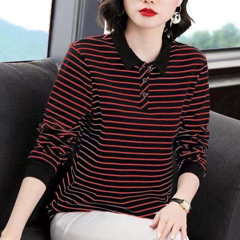 中年春秋装上衣洋气休闲宽松长袖妈妈打底衫翻领大码条纹t恤纯棉