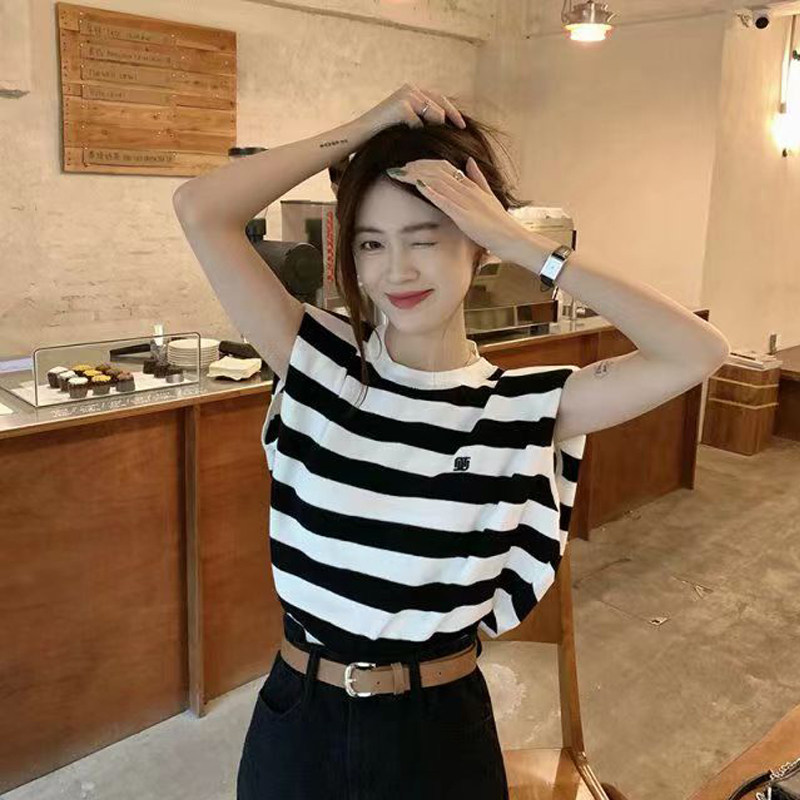 2023夏季新款大码条纹t恤女白色纯棉小众设计感宽松无袖外穿上衣