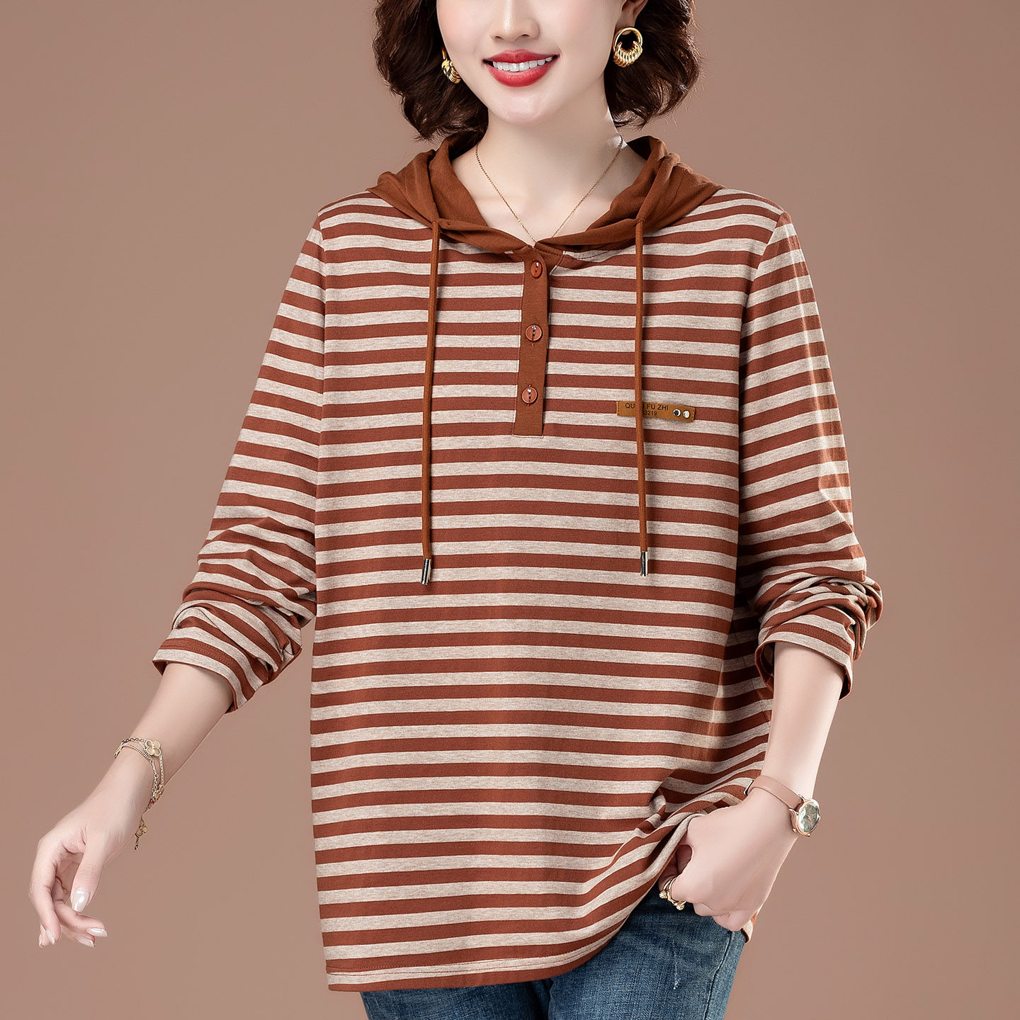 纯棉大码条纹T恤女长袖春秋连帽卫衣中老年女装洋气妈妈遮臀上衣