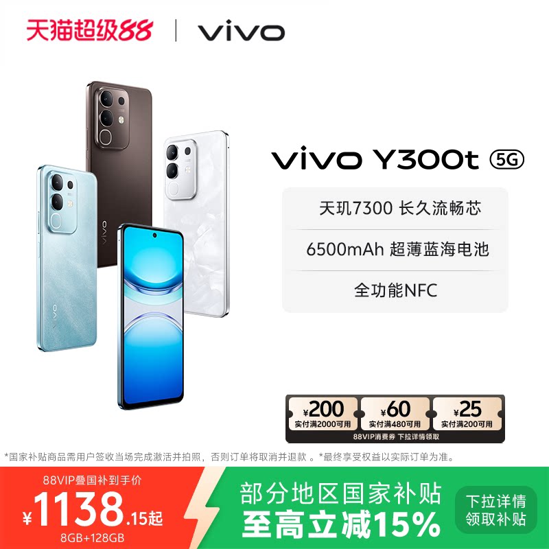 【国家补贴至高立省15%】vivo Y300t手机5G轻薄6500毫安时44W闪充大内存天玑7300耐用手机官网正品
