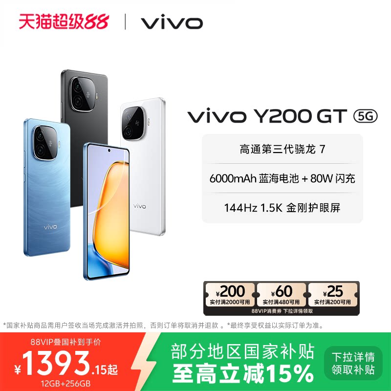 【国家补贴至高立省15%】vivo Y200GT手机5G轻薄6000毫安时长续航80W闪充第三代骁龙7大内存