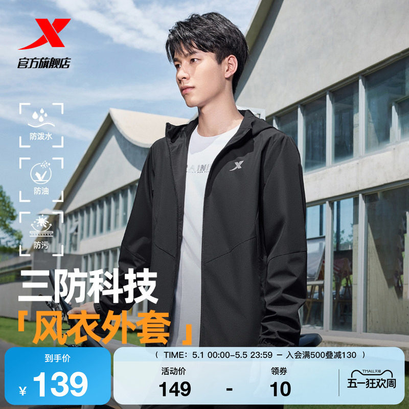 特步防泼水夹克外套男春秋季户外风衣连帽黑色上衣防风运动训练服