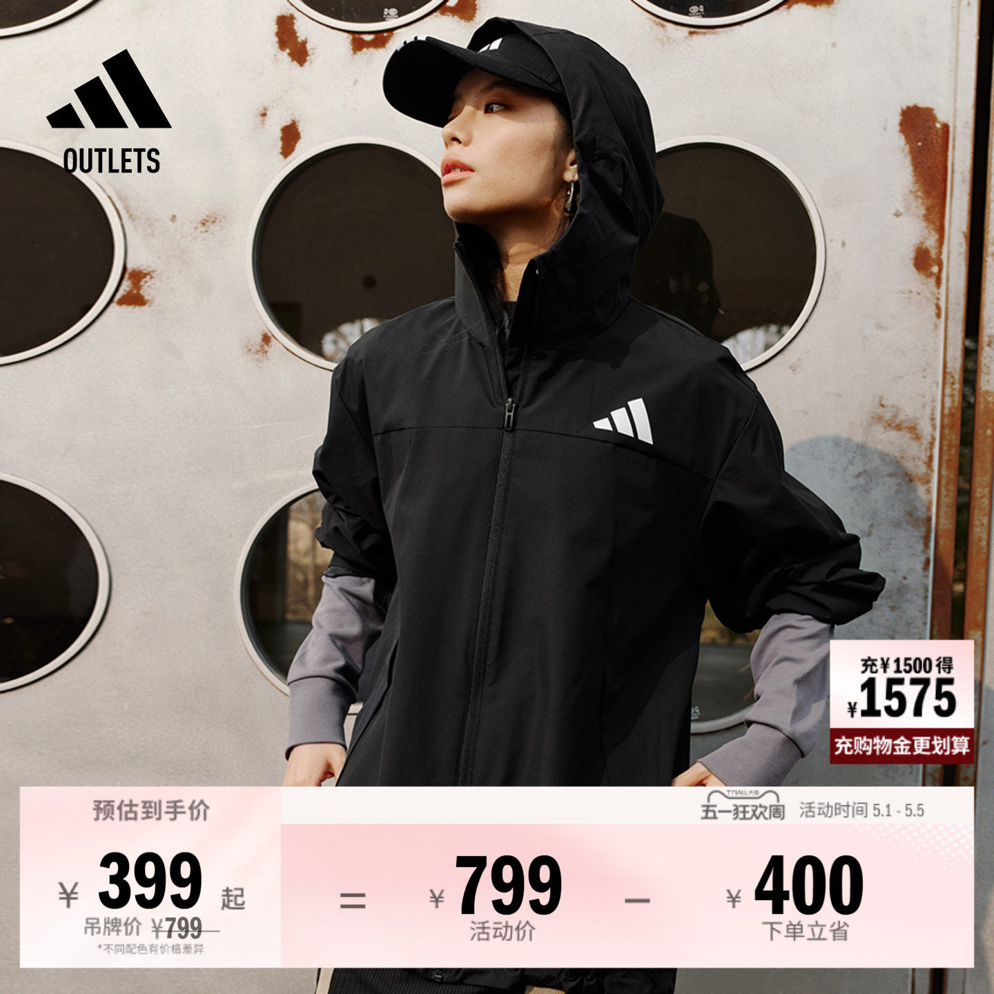 拒水梭织连帽夹克外套男女adidas阿迪达斯outlets轻运动