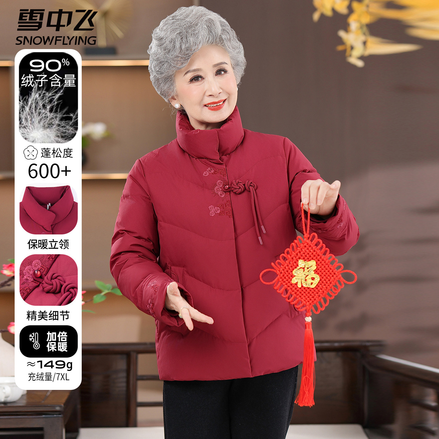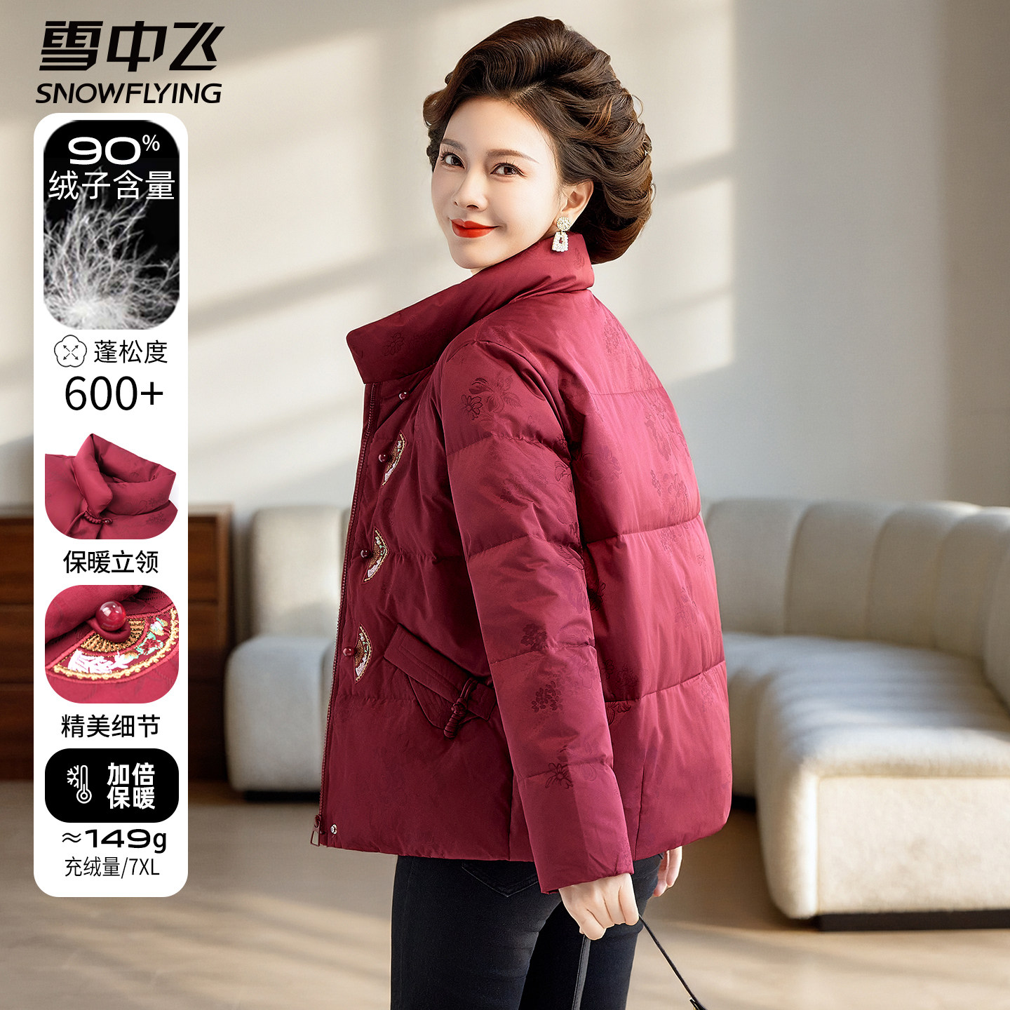 雪中飞羽绒服短款秋冬季喜庆小个子中老年立领冬装奶奶刺绣厚外套