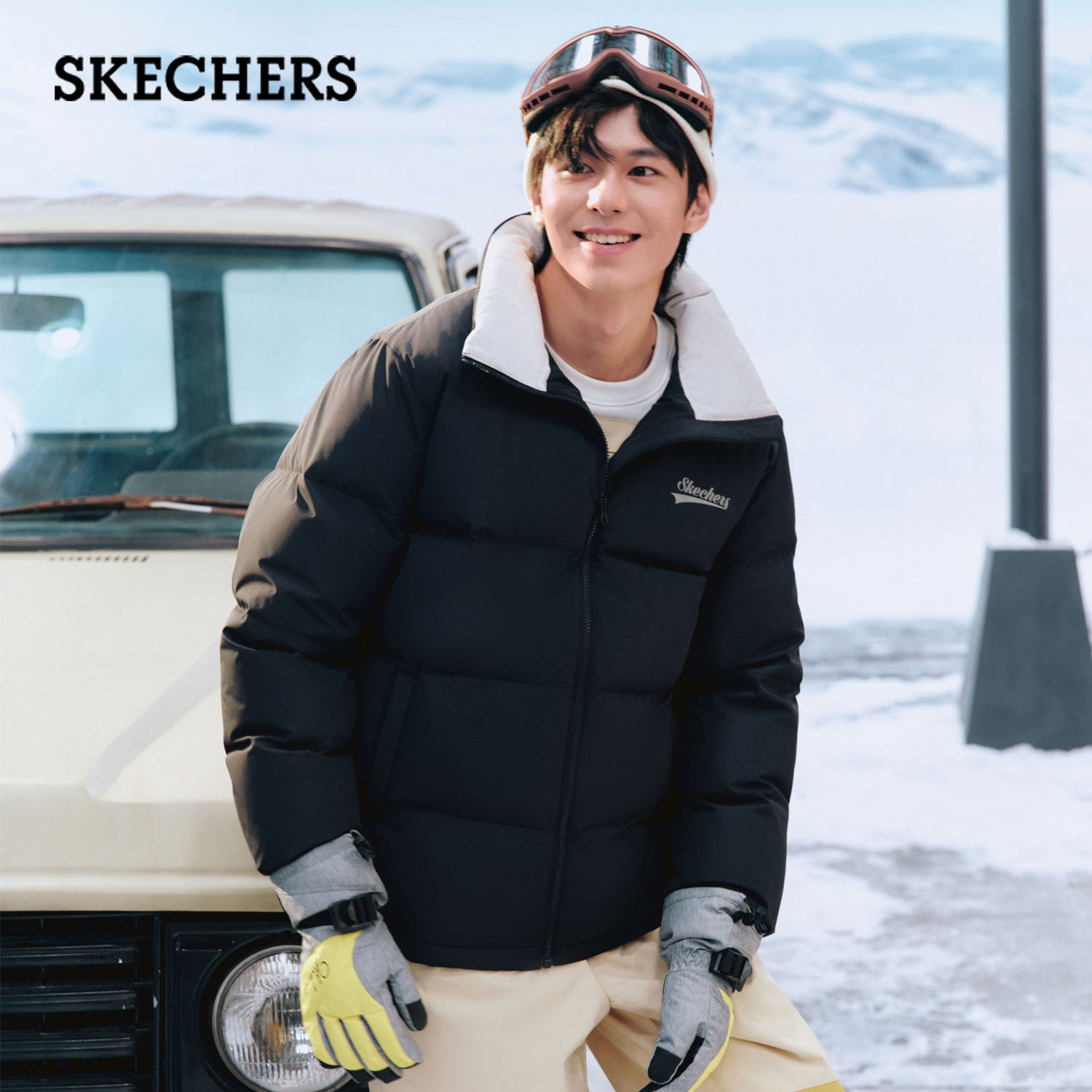 Skechers斯凯奇羽绒服短款秋冬男女防寒保暖鸭绒棉服袄撞色外套