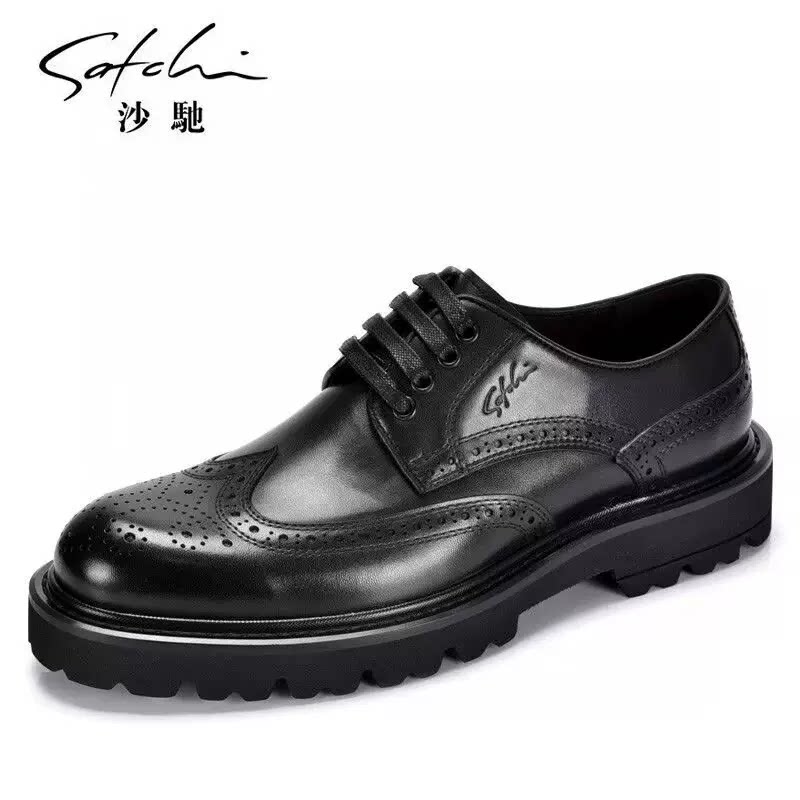 沙驰男鞋商务休闲皮鞋真皮舒适厚底布洛克雕花时尚百搭轻便德比鞋