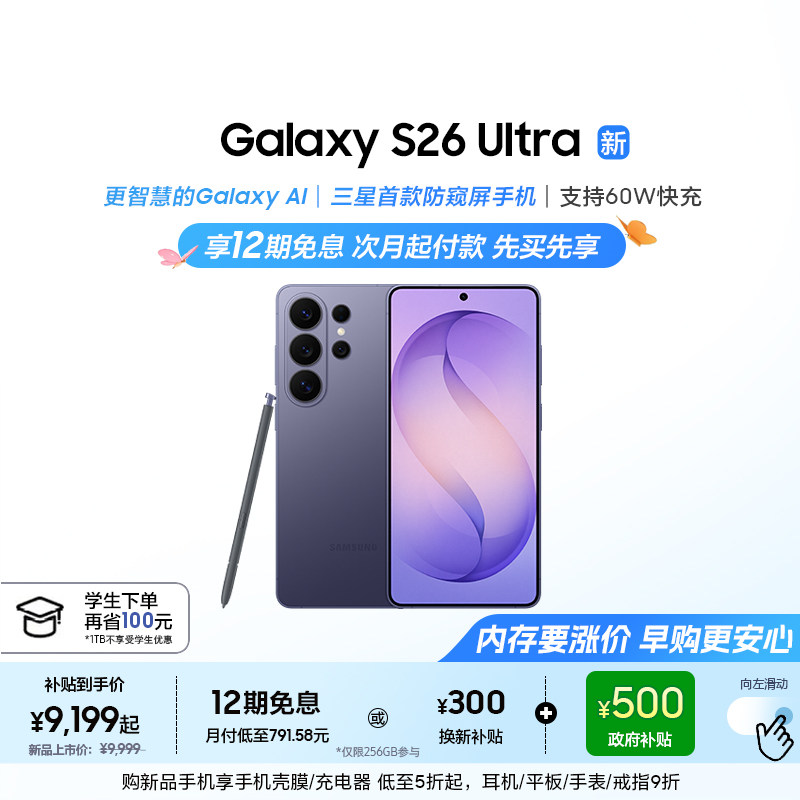 【政府补贴500元】三星首款防窥屏Galaxy S26 Ultra AI游戏手机第五代骁龙8至尊版2亿像素拍照旗舰智能