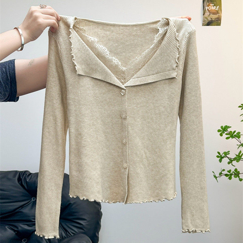 十三行2025秋装新款法式温柔风木耳边翻领针织开衫女蕾丝拼接毛衣