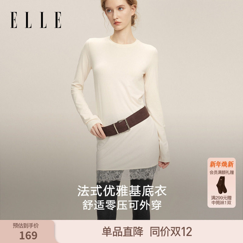 ELLE加氛项桑蚕丝打底衫女蕾丝花边拼接时尚百搭内搭长袖T恤新款